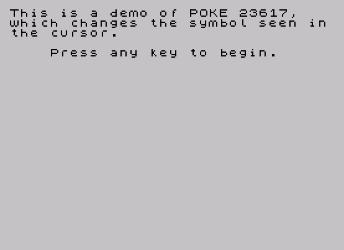 1 PRINT "This is a demo of POKE 23617, which changes the symbol seen inthe cursor.": PRINT : PRINT " Press any key to begin."