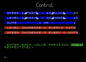 Dam Attack is an educational math game in which the player must correctly answer addition or subtraction problems to prevent a dam from flooding. Math problems scroll across the screen toward a dam graphic, and the player types the answer before the question reaches the wall; a wrong answer or a miss causes the dam to break and water to fill the screen. The game features an extensive setup routine that uses machine code (poked directly into memory via USR) to copy character set data, redefining 43 individual characters plus 20 UDGs to create custom graphical fonts for the title screen and gameplay graphics. Configurable parameters include problem difficulty level, scroll speed, and automatic level/speed progression tied to hit counts, all entered through an interactive settings screen.