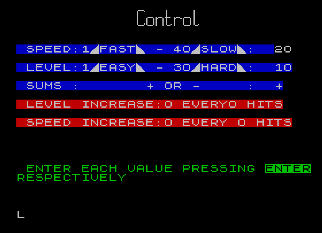 Two independent hit counters, O and K, track how many correct answers have been given. After B hits, the level L increases by A (capped at 30). After D hits, the scroll delay S decreases by C (floored at 1). Both counters reset to their respective trigger values after firing. These parameters are all user-configurable from the settings screen at line 1650.