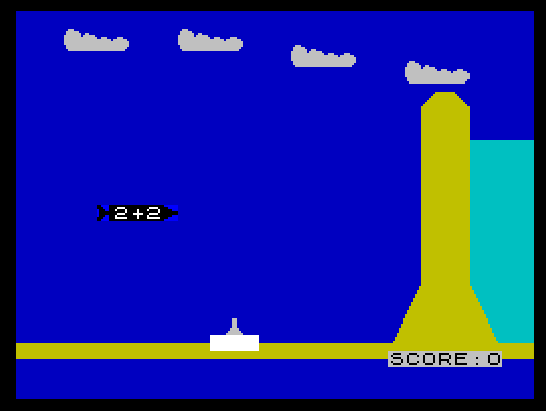 "\\\\\\\\\"at line990is printed withOVER 1to XOR-erase the scrolling question during the correct-answer animation. ATTR (M,N+LEN M$+2)=54at line670detects collision with the dam wall by reading the screen attribute of the cell just ahead of the problem string; attribute 54 corresponds to INK 6, PAPER 6 (the dam’s yellow color).VAL "PEEK 23675+256*PEEK 23676"and similar constructions protect against the interpreter pre-evaluating system variable reads at parse time — a standard Spectrum BASIC technique for dynamic memory queries.- The scrolling problem display uses embedded color-escape strings built with