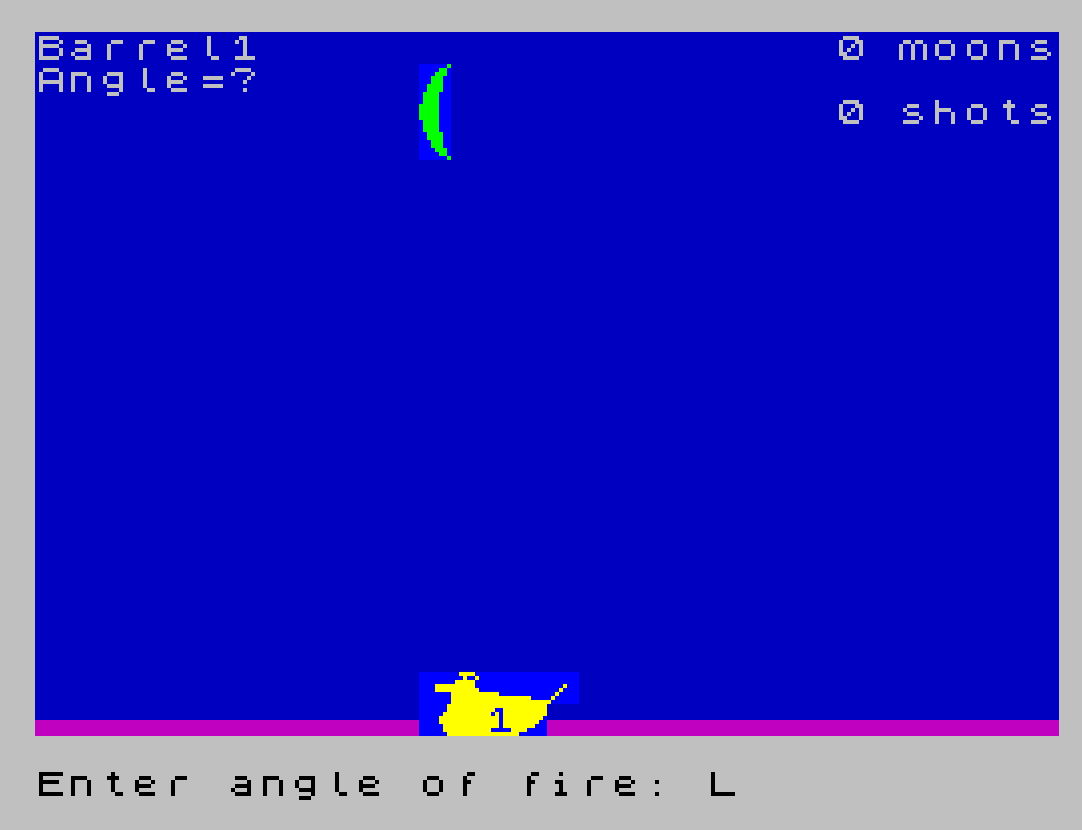 140 PRINT AT 0,0;"Barrel "' FLASH 1;"Angle=? "; FLASH 0;AT 0,25;hm;" moons";AT 2,25;s;" shots"
