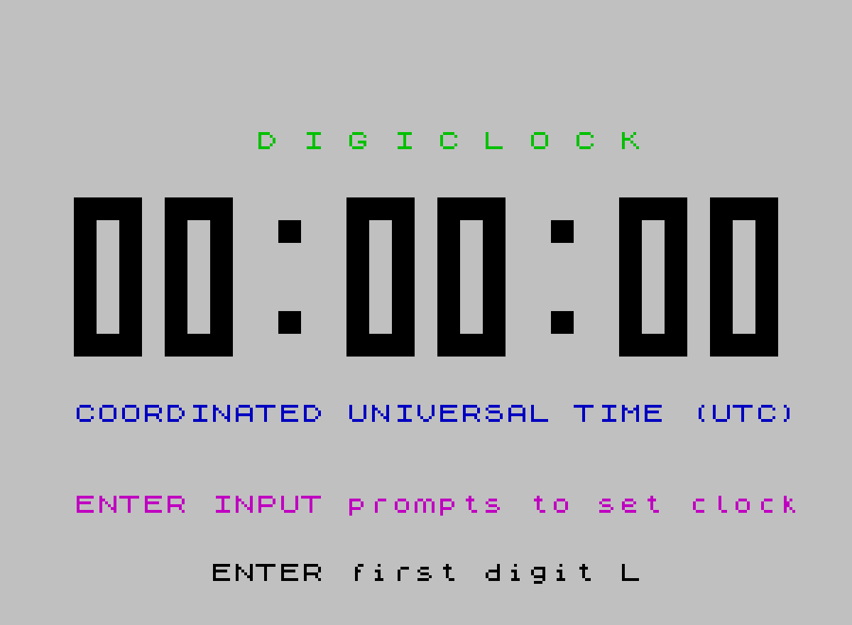 4030 PRINT INK 4;AT 4,8;"D I G I C L O C K"; INK 3;AT 20,0;"ENTER INPUT prompts to set clock"; INK 1;AT 16,0;"COORDINATED UNIVERSAL TIME (UTC)"