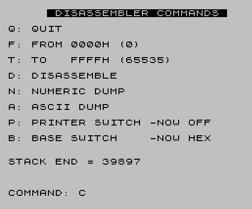 300 CLS : PRINT TAB 5;" DISASSEMBLER COMMANDS "