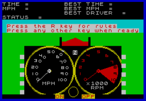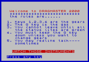 DRAGMASTER 2000 is a drag racing simulation that challenges the player to launch from a standing start, shift through four gears, and complete a quarter-mile run as quickly as possible. The program loads an external machine code file (“dragmc”) at address 50000 and calls several USR routines at addresses such as 50008, 51060, 51075, 51150, 51230, and 51250 for engine sound, tachometer animation, and display updates. Joystick input is handled via the STICK command, with keys 1–4 for gear selection and “g” for throttle. Six user-defined graphics (UDGs “a” through “f”) are defined at startup to render car silhouettes and track scenery on the title and race screens. A timer built from system variables at addresses 23672–23674 measures elapsed time to hundredths of a second, and a best-time leaderboard with player initials is maintained across runs.