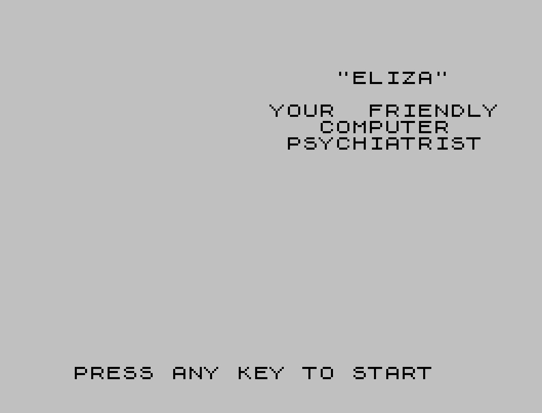 9999 CLEAR 63500: PRINT AT 9,4;"Now loading ""Eliza"" data",,," LEAVE RECORDER RUNNING": LOAD "ELIZA"CODE : PRINT "screen$ now loading": LOAD "Screen$"SCREEN$ : GO TO 10