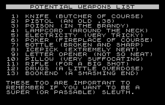 150 PRINT ,,"HOLD ON AND WE WILL SHOW YOU","A LIST OF SUSPECTS AND POSSIBLE","MURDER WEAPONS. ALSO, IF YOU","WISH, WE WILL AGAIN SHOW YOU A","LAYOUT OF THE HOUSE."