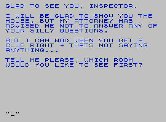 8520 PRINT PAPER 1;AT 12,0;" CHEATING takes the fun out of our little game, Inspector "