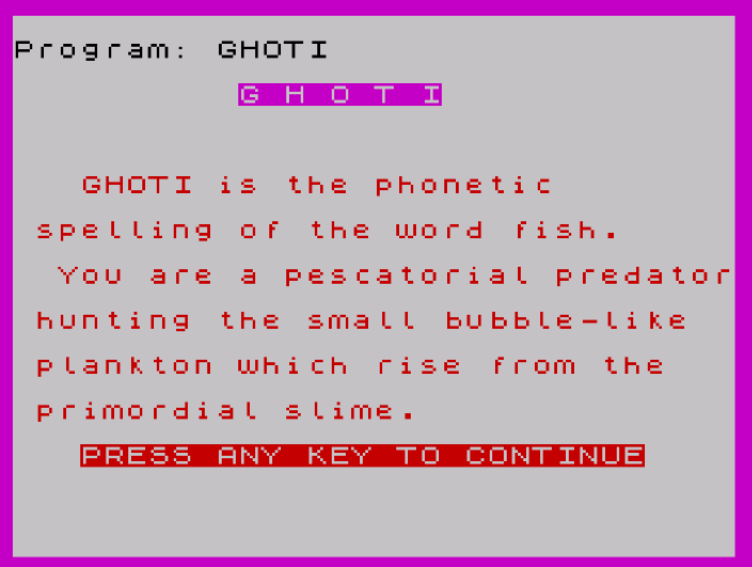 9135 PRINT AT 7,3;"GHOTI is the phonetic"''" spelling of the word fish."''" You are a pescatorial predator"''" hunting the small bubble-like"''" plankton which rise from the"''" primordial slime."''TAB 3; INVERSE 1;"PRESS ANY KEY TO CONTINUE"