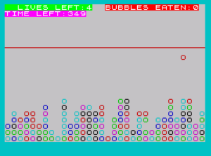 Bubbles are represented by the character “O” printed with INK 2. Each bubble spawns at a random column (y=INT(RND*25)) near the bottom of the screen and rises one row per game cycle (line 350: LET x=x-1). A slight horizontal drift is added each cycle at line 121 (LET y=y+RND*2), with clamping at line 125 to keep bubbles on screen. Collision between fish and bubble is detected at line 157 using ATTR comparison — a color-attribute trick rather than coordinate comparison, meaning ink/paper attribute equality triggers the pickup.