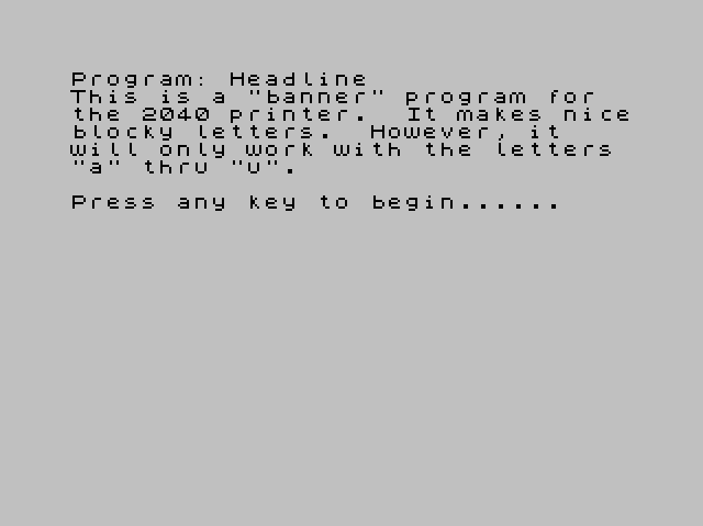 This is a “banner” program for the 2040 printer. It makes nice blocky letters. However, it will only work with the letters “a” thru “u”.