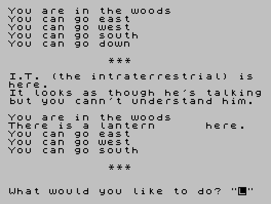 6000 DATA "east",21,N1,"west",22,N2,"north",22,N1,"south",23,N2,"up",18,N1,"down",19,N2,"kill",16,3,"help",20,4,"take",11,N1,"drop",12,N2,"invent",7,N1,"bandage",8,N2,"lantern on",7,4,"lantern off",3,3,"read",N2,N1