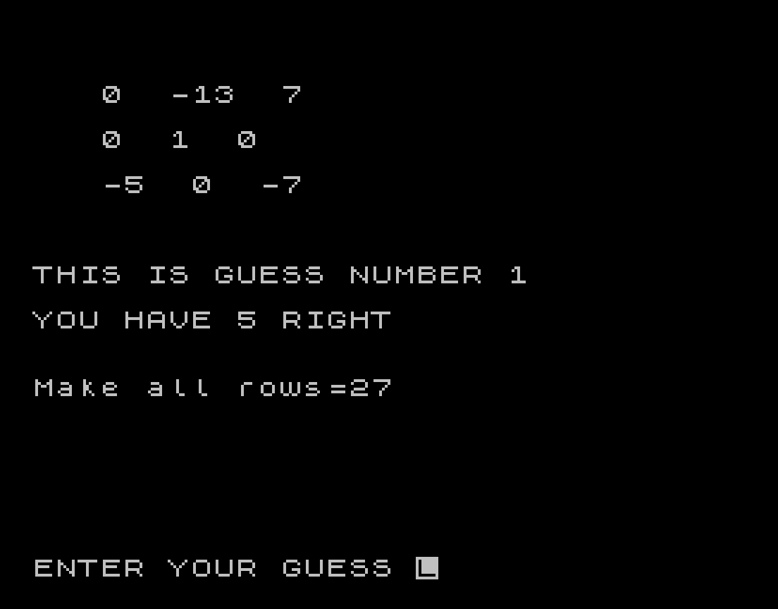 “Idaho Squares” is a number puzzle game in which the player must reconstruct a 3×3 grid of integers by guessing missing values. The grid is generated using four random variables (A, B, C, D) constrained to be distinct, and each cell is an arithmetic combination of those variables such that every row sums to 27. The player sees blanked-out cells (stored as zeros in array B) and enters guesses one at a time; a correct guess for a cell fills it in permanently. The program tracks the number of guesses with variable J and reports how many cells are correctly placed after each guess using a simple match-count loop.