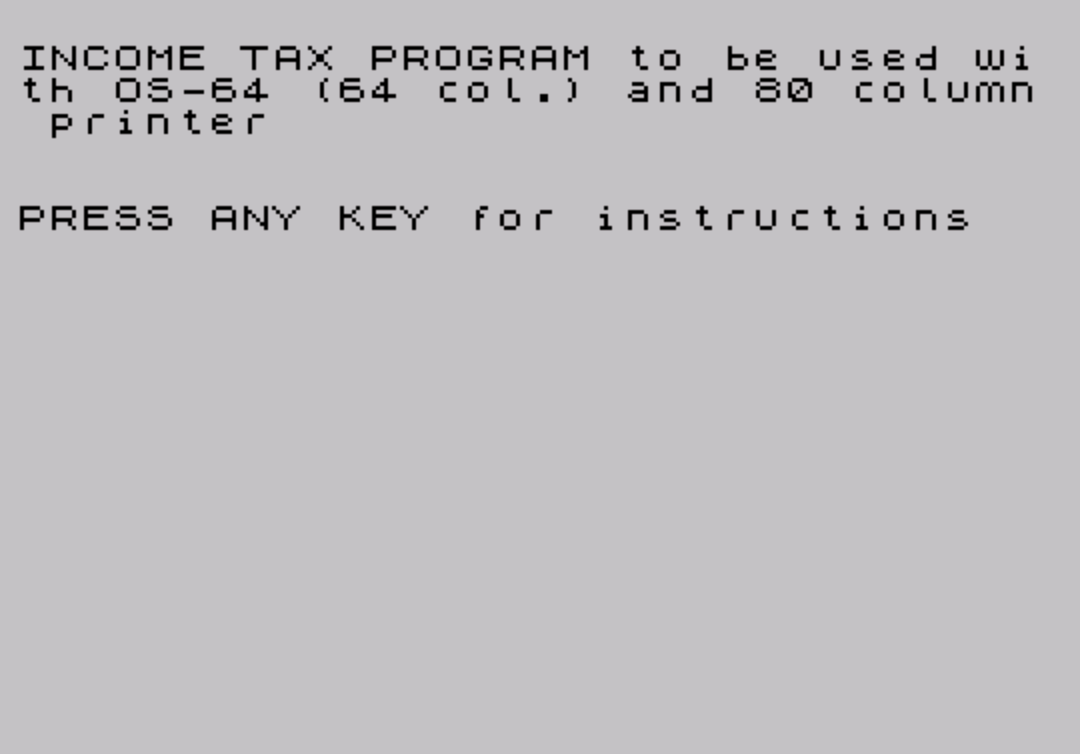 10 POKE 23658,0: PAPER 7: CLS : PRINT ''"INCOME TAX PROGRAM to be used with OS-64 (64 col.) and 80 column printer": PRINT ''"PRESS ANY KEY for instructions": PAUSE 0: GO SUB 3400