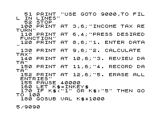 130 PRINT AT 9,6;"2. CALCULATE TAX"