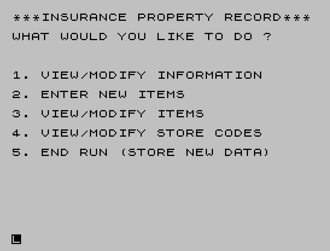 105 PRINT AT Z,Z;"***INSURANCE PROPERTY RECORD***"