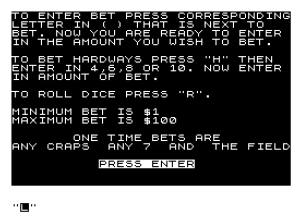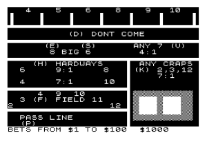Kasino Kraps is a casino-style craps dice game that simulates a full craps table layout drawn entirely with inverse-video characters and block graphics. The program supports multiple simultaneous bet types including Pass Line, Don’t Come, Field, Hardways (4, 6, 8, and 10), Any Craps, Any 7, and Big 6/8, each mapped to a keyboard letter for quick input. Dice are rendered on-screen using asterisk characters positioned within block-graphic frames, with separate display routines for each face value of both dice. Payouts follow standard casino odds — hardways pay 7:1 or 9:1 depending on the number, Any 7 pays 4:1, Any Craps pays 7:1, and Field bets pay 1:1, 2:1, or 3:1 based on the roll. The Don’t Come bet implements a two-roll tracking mechanism using variables D1 and D3 to remember the established point across subsequent rolls.