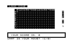 STOPhalts execution,LET SS=0resets the high score, andSAVE "LAND MINE"preserves the program withSSat zero, after whichGOTO 1restarts. - Unreachable code: Lines 500 and 519–540 contain a dead branch — line 500 jumps directly to 560, bypassing the booby-trap reset logic at 519–540 entirely. The intended booby-trap path (zero-cell handling at line 266) calls