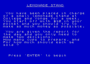 1440 PRINT ''" You have been placed in charge of a small lemonade stand at College and Yonge for a week. You start off with $10 in your pocket and you should try to make as much money as possible."