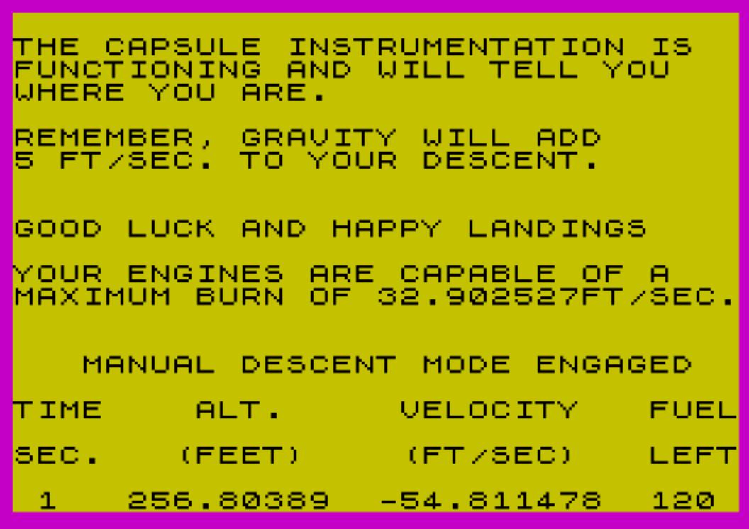 140 PRINT "TO SAVE THE CAPSULE YOU MUST LAND AT LESS THAN 2 FT/SEC.": PRINT