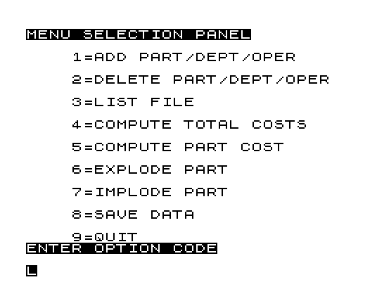 1030 PRINT AT 4,4;"1=ADD PART/DEPT/OPER"