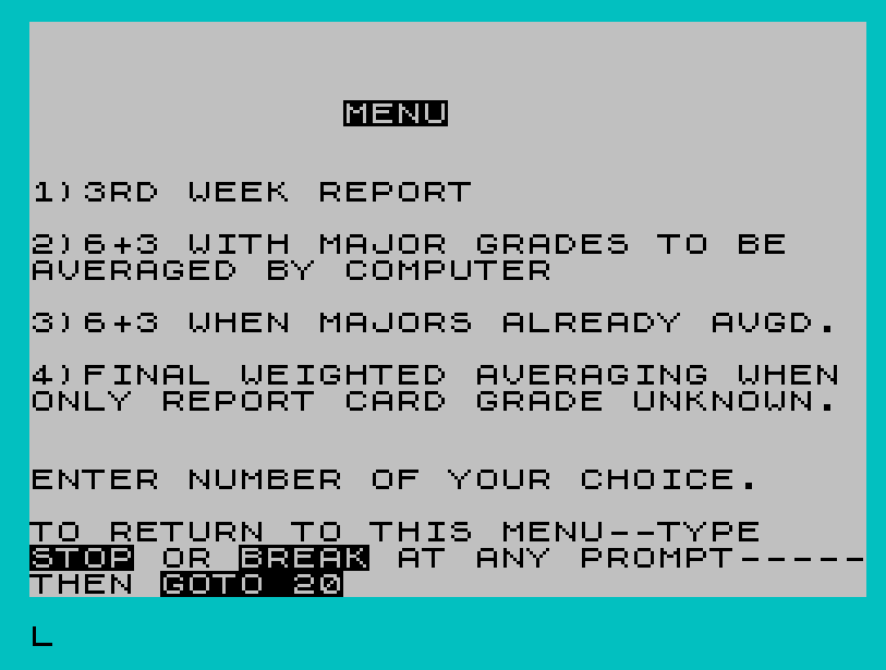 20 PRINT AT 3,12;"MENU";AT 6,0;"1)3RD WEEK REPORT";AT 8,0;"2)6+3 WITH MAJOR GRADES TO BE AVERAGED BY COMPUTER";AT 11,0;"3)6+3 WHEN MAJORS ALREADY AVGD.";AT 13,0;"4)FINAL WEIGHTED AVERAGING WHEN ONLY REPORT CARD GRADE UNKNOWN."