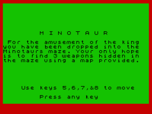 15 PRINT AT 6,7;" M I N O T A U R ";AT 8,0;" For the amusement of the king you have been dropped into the Minotaurs maze. Your only hope is to find 3 weapons hidden in the maze using a map provided."