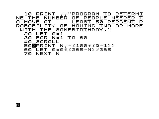 10 PRINT ,,"PROGRAM TO DETERMINE THE NUMBER OF PEOPLE NEEDED TO HAVE AT LEAST 50 PERCENT PROBABILITY OF HAVING TWO OR MORE WITH THE SAMEBIRTHDAY."