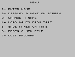 60 PRINT ''"1- ENTER NAME"''"2- DISPLAY A NAME ON SCREEN"''"3- CHANGE A NAME"''"4- LOAD NAMES FROM TAPE"''"5- SAVE NAMES ON TAPE"''"6- BEGIN A NEW FILE"''"7- QUIT PROGRAM"