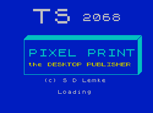 Pixel Print Desktop Publisher is the core module of a desktop publishing suite for the TS2068. It supports newsletter creation for both full-size printers and the T/S 2040, and accepts text imported from word processors — including Tasword — for multi-column layout. Character width is scalable up to 32 times standard size, with height expandable to 22 times normal. The base package includes four fonts — TX 2068 Standard, Bold, Modern, and Italics — plus underline support, with the option to load custom fonts or the separately available Font Package accessory tape.