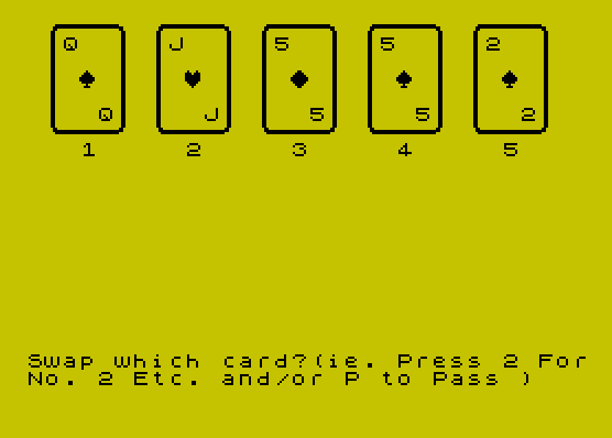 2390 PRINT AT 19,NOT PI;"Swap which card?(ie. Press 2 ForNo. 2 Etc. and/or P to Pass )",