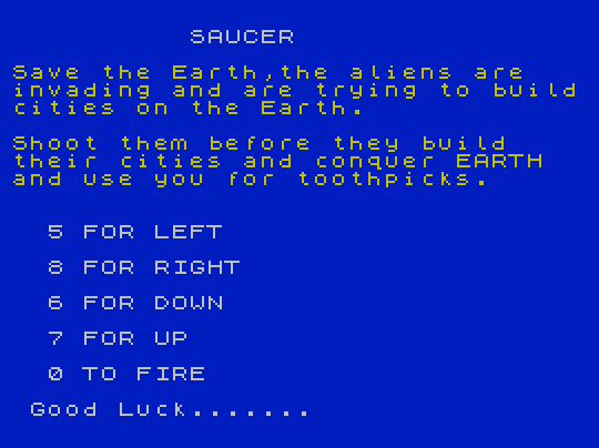 4020 INK 6: PRINT : PRINT "Save the Earth,the aliens are invading and are trying to buildcities on the Earth.": PRINT : PRINT "Shoot them before they build their cities and conquer EARTH and use you for toothpicks."