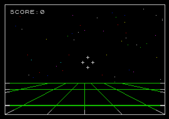 PLOT/DRAWto lay out the playfield geometry and border. - Lines 125–999: Main game loop — erase crosshair, read keys, move saucer, check collisions, play tones, update display, repeat via
