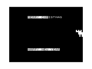 100 PRINT AT 10,0;B$( TO 32);AT 11,0;C$( TO 32);AT 12,0;D$( TO 32);AT 4,8;"MERRY CHRISTMAS";AT 18,8;"%H%A%P%P%Y% %N%E%W% %Y%E%A%R";AT 4,8;"%M%E%R%R%Y% %C%H%R%I%S%T%M%A%S";AT 18,8;"HAPPY NEW YEAR"