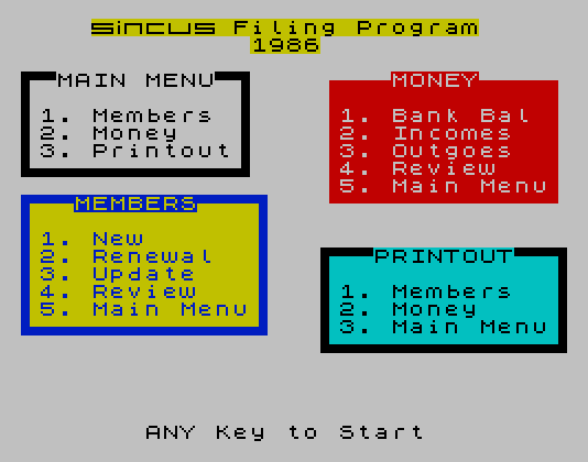 206 PRINT AT 4,0;"\: \ :"'"\: 1. Members \ :"'"\: 2. Money \ :"'"\: 3. Printout\ :"'"\:.\..\..\..\..\..\..\..\..\..\..\..\.:"