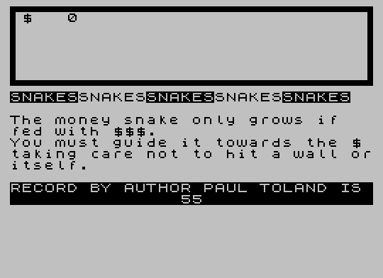 110 PRINT ,,"The money snake only grows if fed with $$$.",,"You must guide it towards the $ taking care not to hit a wall oritself."''"RECORD BY AUTHOR PAUL TOLAND IS 55 "