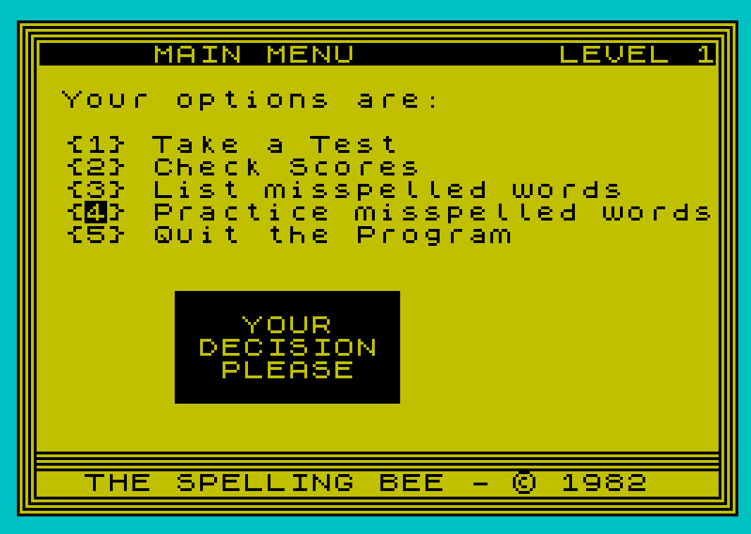 820 PRINT AT 7,bu;"{3} List misspelled words";AT 8,bu;"{4} Practice misspelled words"