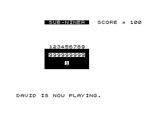 Sub-Niner is a single-player number puzzle game where the player must reduce all nine digits of a number string to zero by repeatedly subtracting a randomly generated value. Each turn, a random number R (1–9, weighted toward smaller values via RND*RND) is displayed, and the player selects which digit position (1–9) to subtract it from; selecting position 0 skips the turn. If a digit would go below zero, a penalty subroutine adds 10 to the digit and increases the move count by R, simulating a borrow/wrap mechanic. The score is calculated as 101 minus the total number of moves taken, and a high-score table tracking the best player name and score persists across rounds within the same session.