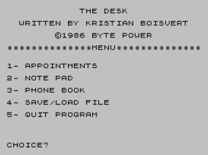 This program will store up to 100 appointments and 39 phone numbers/addresses. It also features a NOTE-PAD. When the program...