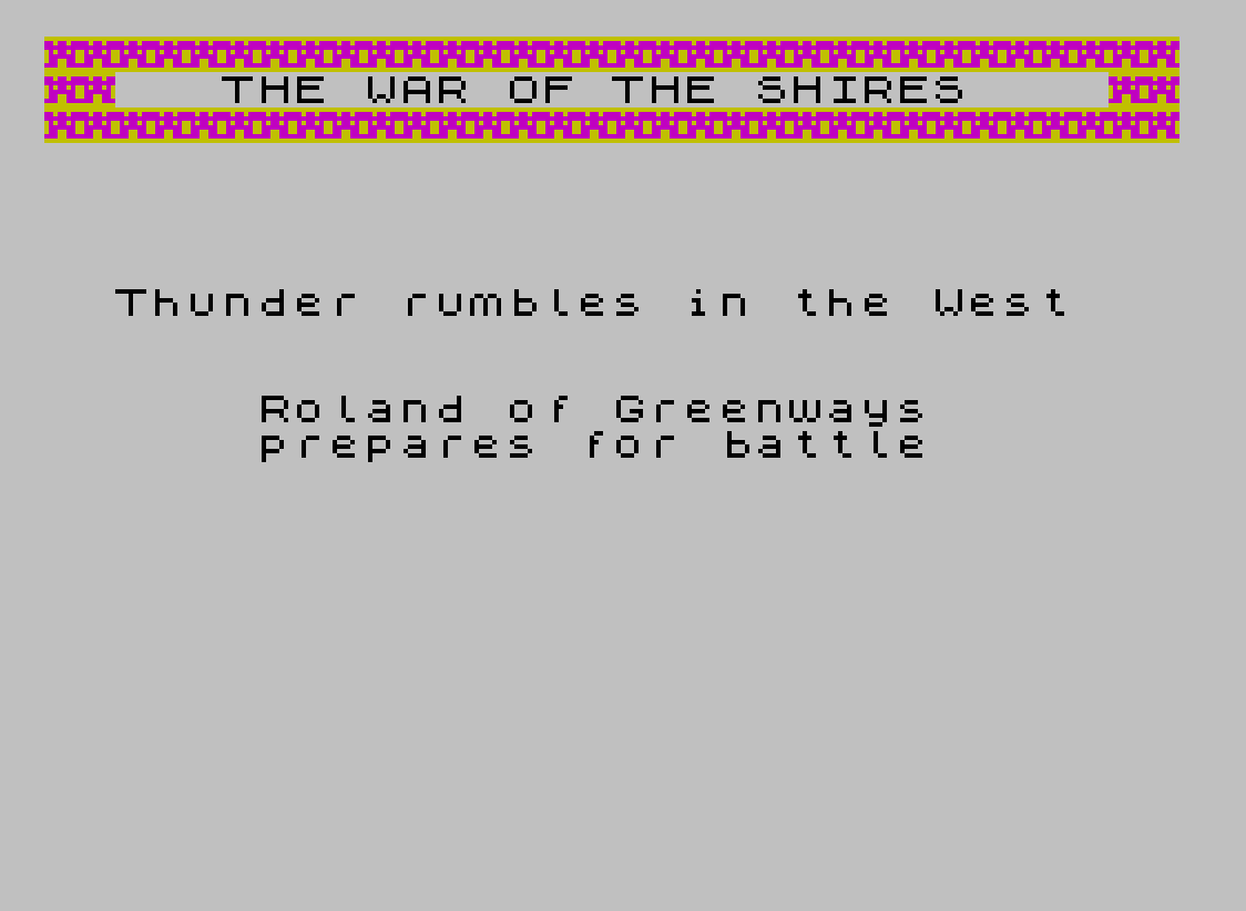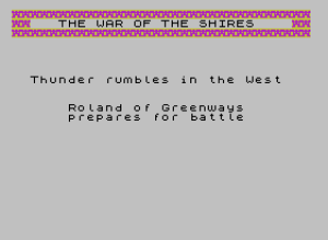 8920 LET z$="THE WAR OF THE SHIRES": LET code=149: GO SUB 16: LET z$="Thunder rumbles in the West": PRINT AT 7,0;: GO SUB 40: LET z$=FN f$(1): PRINT AT 10,0;: GO SUB 40: LET z$="prepares for battle": PRINT AT 11,0;: GO SUB 40