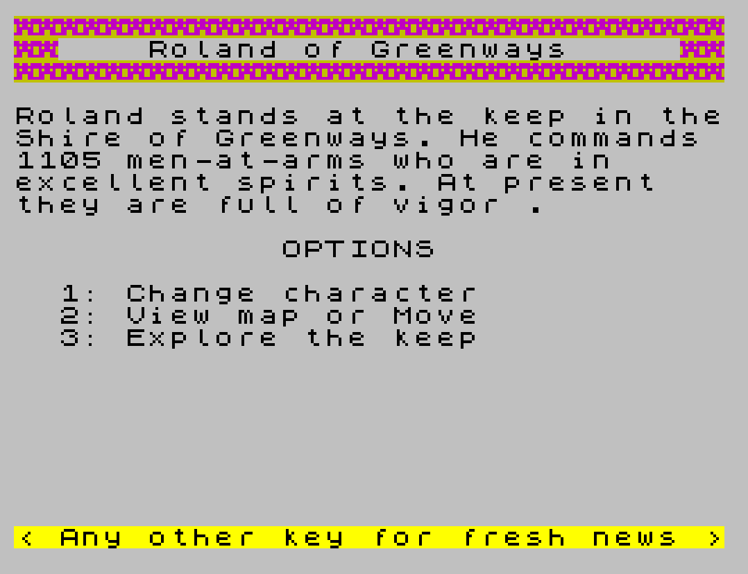 2 DEF FN d$(x)=p$(x,3 TO CODE p$(x,2)): DEF FN b$(x)=p$(x,CODE p$(x,1) TO CODE p$(x,2)): REM GO Around To Meet Other Characters Visit Villages to Build Army