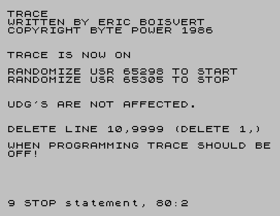 20 CLEAR 64600: PRINT "TRACE WRITTEN BY ERIC BOISVERT COPYRIGHT BYTE POWER 1986"'''