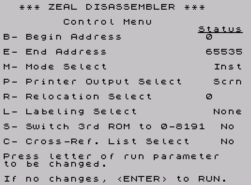 9860 LET B=PEEK A+V*PEEK (A+U): CLS : PRINT " ";T$;AT 2,8;"Control Menu";AT 3,26;"Status";AT 3,26; OVER U;"______"'"B- Begin Address";TAB 27;B''"E- End Address";TAB 27;E''"M- Mode Select";TAB 28;"Inst" AND NOT M;"DEFB" AND M=U;"DEFW" AND M=U+U''"P- Printer Output Select";TAB 28;"Prtr" AND O;"Scrn" AND NOT O''"R- Relocation Select";TAB 27;D''"L- Labeling Select";TAB 28;"Lbls" AND l>PI;"None" AND NOT l''"S- Switch 3rd ROM to 0-8191";TAB 29;"Yes" AND S;"No" AND NOT S''"C- Cross-Ref. List Select";TAB 29;"Yes" AND X;"No" AND NOT X''"Press letter of run parameter to be changed.": BEEP .05,-10: PRINT #U;"If no changes, <ENTER> to RUN."