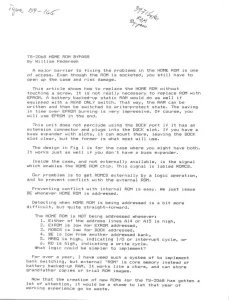 This article shows how to replace the HOME ROM without touching a screw. It is not really necessary to replace ROM with EPROM. A battery backed-up static RAM would do as well if equipped with a READ ONLY switch. That way, the RAM can be written and then be switched to write-protect state. The saving in time over EPROM burning is very impressive. Of course, you will use EPROM in the end.