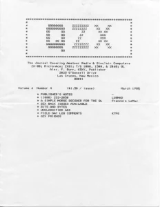 K7FG writes that he agrees with all the comments that K2QF wrote in his very fine article in the February issue about his field day log program comments except for the item about scratching line 4412. He would rather change line 160 to DIM T$(7) so that one could correct a long entry error. In |