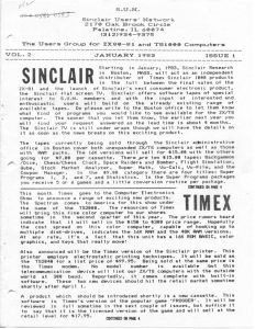 | Timex [News] | CES announcements from Timex including the TS2000 (Spectrum for North America), the $99.95 TS2040 printer, a Timex modem, and the Frogger game. | Timex/Sinclair 1000, Timex/Sinclair 2000 |