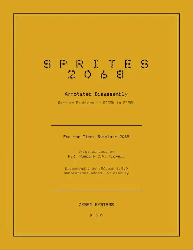 This sprite graphics demonstration and utility suite for the TS2068, built around a machine code “Sprite Service Package” loaded at address 60160, is a corrected and updated version of the sprite code from the Timex/Sinclair 2068 Technical Manual.