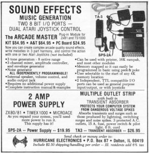 Sound module with three tone generators, 8 octave range, 3 channel mixer, noise source; uses AY-3-8910. Two TTL I/O ports with mating connectors for Atari joysticks. Memory-mapped.