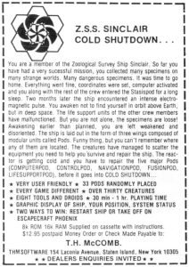 You are the sole surviving member of the crew of the Zoological Survey Ship Sinclair. You awaken from stasis only to find the alien specimens roaming the ship and a cold shutdown of the ships reactor only hours away! You must fight off the creatures and repair the ship before time runs out. 33 pods, unlimited aliens, tools, etc. 16K.
